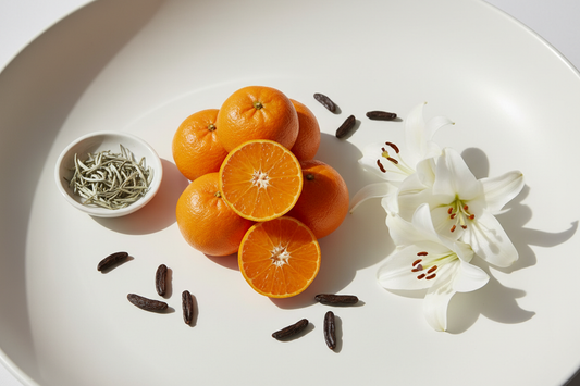 Fresh and calming — bright mandarin, delicate white tea, and a hint of warm tonka bean