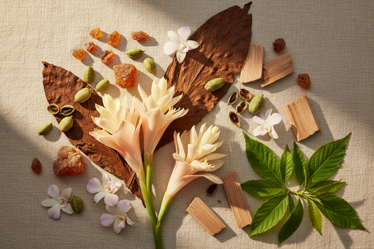 Warm and exotic — ginger lily and cardamom with amber, tobacco, and orchids over sandalwood and patchouli