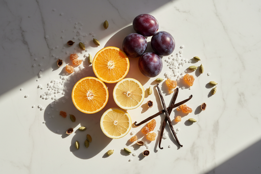Fruity and fresh — citrus and sea salt with plum and cardamom over a warm amber-vanilla base